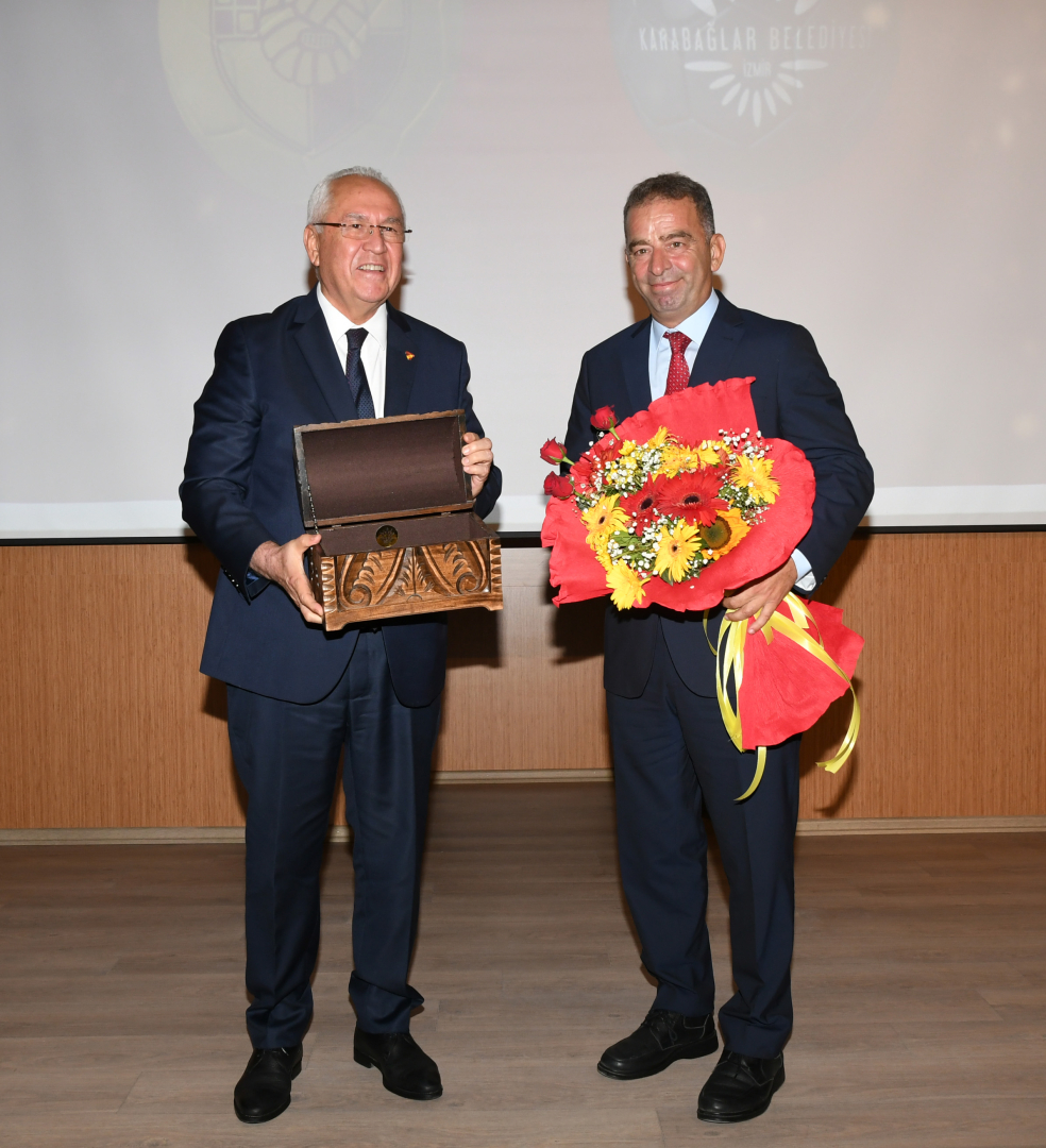 Daha sonra alkışlarla kürsüye gelen Başkan Selvitopu, Göztepe'nin tarihine derin izler bırakmış değerleri Karabağlar Belediyesi çatısı altında ağırlamaktan büyük bir mutluluk ve gurur duyduklarını söyledi.