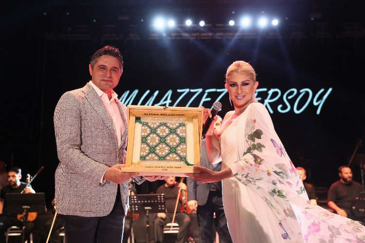 Konserin bir bölümünde davet üzerine sahneye gelen Aliağa Belediye Başkanı Serkan Acar, ‘Nostalji Kraliçesi’ Muazzez Ersoy’a ‘Aliağa Sanat Günleri’ne katılımlarından dolayı teşekkür ederek Aliağalı üretici kadınlar tarafından el emeği ile hazırlanan Helvacı Kilimi hediye etti.