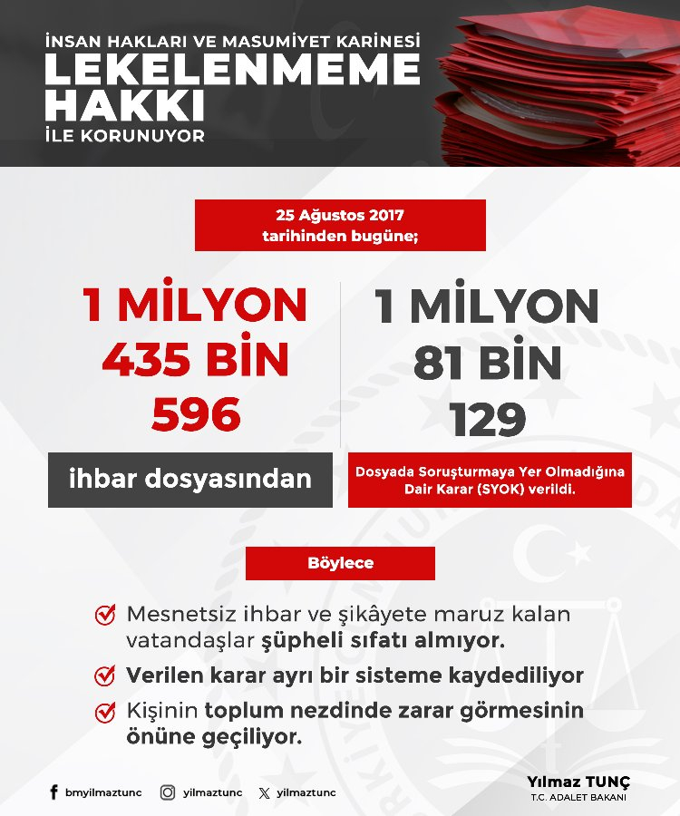 Konuyla ilgili sosyal medya hesabından paylaşımda bulunan Adalet Bakan Yılmaz Tunç, 2017 yılında bugüne toplamda 1 milyon 435 bin 596 ihbar dosyasından 1 milyon 81 bin 129’u hakkında soruşturmaya yer olmadığına dair karar verildiğini duyurdu.