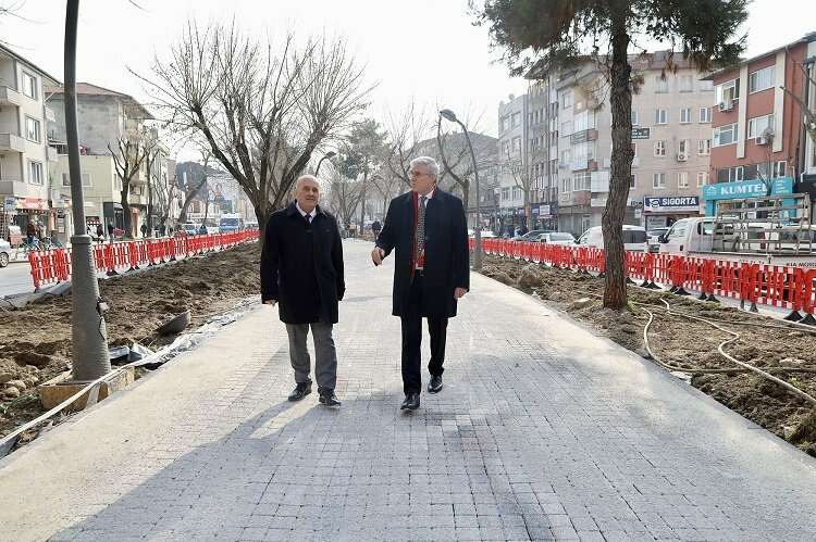 Proje hakkında bilgi veren Başkan Yüce, “Vatandaşlarımız ve proje güvenliği için ilk iş olarak proje alanının bariyerlerle kapattık. Zamanla deforme olan ve kullanım ömrünü doldurmuş kaldırımlar sökülerek, kilim desenli yürüyüş yolunun inşa faaliyeti devam ediyor. Aydınlatma elemanlarının montajı tamamlanarak altyapı işlemlerini tamamladık. Kent mobilyalarının montajı ve gerekli peyzaj düzenlemesinin dönüşümü ile projemiz tamamlanacak. Şehrin kalbindeki ticareti hızlandıracak sosyal bir alan inşa ediyoruz” dedi.