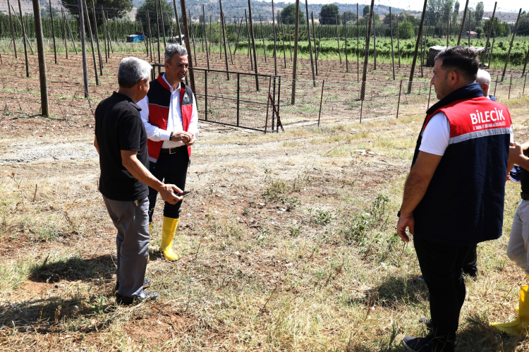 Bilecik İl Tarım ve Orman Müdürü Necmettin Yoldaş, TARSİM Bursa Bölge Müdürü Mustafa Değer ve teknik ekiplerce zarara uğrayan tarım arazilerinde özellikle şerbetçi otu, fasulye ve ayçiçeği gibi ürünlerde inceleme yaptı.
