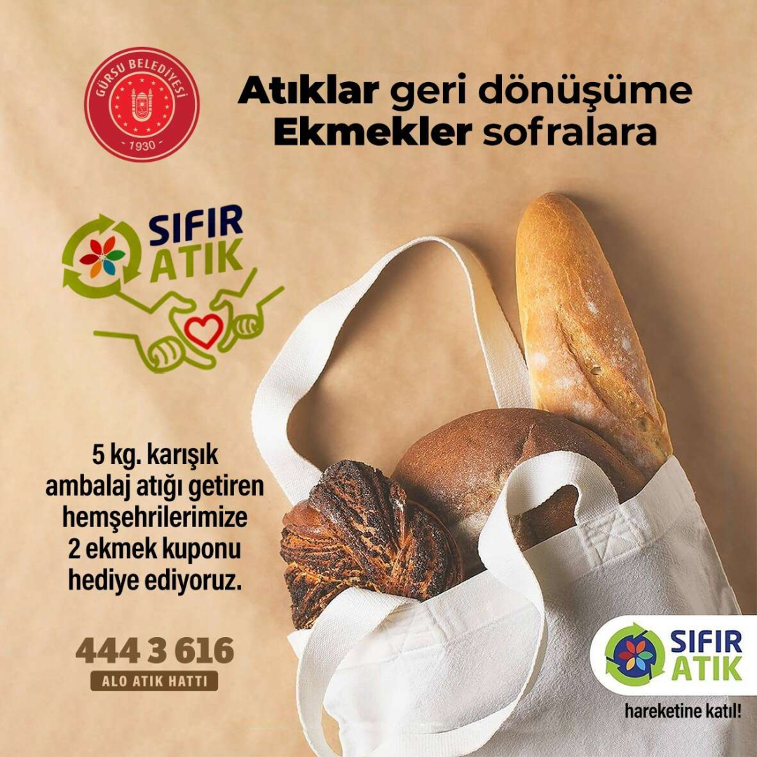 BURSA (İGFA) -Gürsu Belediyesi İklim Değişikliği ve Sıfır Atık Müdürlüğü’nce, “Atıklar geri dönüşüme ekmekler sofralara” sloganıyla başlatılan kampanya kapsamında, 5 kg karışık ambalaj atığı getiren 2 ekmek alabiliyor.