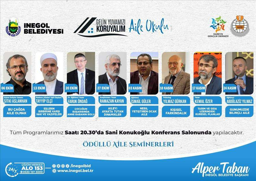 Bursa'da İnegöl Belediyesi’nin AHİD ve Dareyn Gençlik Derneği iş birliğinde gerçekleştirdiği “Aile Okulu” eğitimleri bu hafta başlıyor. Cuma akşamları Sani Konukoğlu Konferans Salonunda yapılacak eğitimler 8 hafta boyunca devam edecek. Her hafta farklı bir konuğun katıldığı seminerler düzenlenecek.