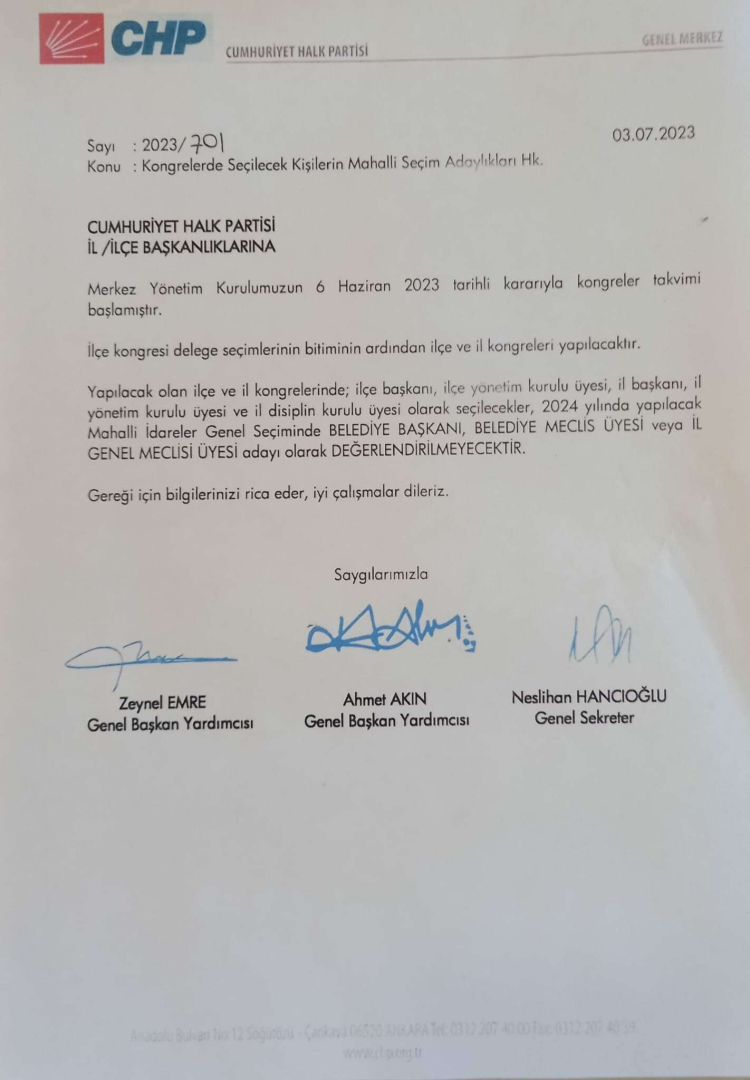 Böylece 2024 yerel seçimleri için ilçe ve il kongrelerini ilk basamak olarak gören adayların önü kesilmiş oldu.