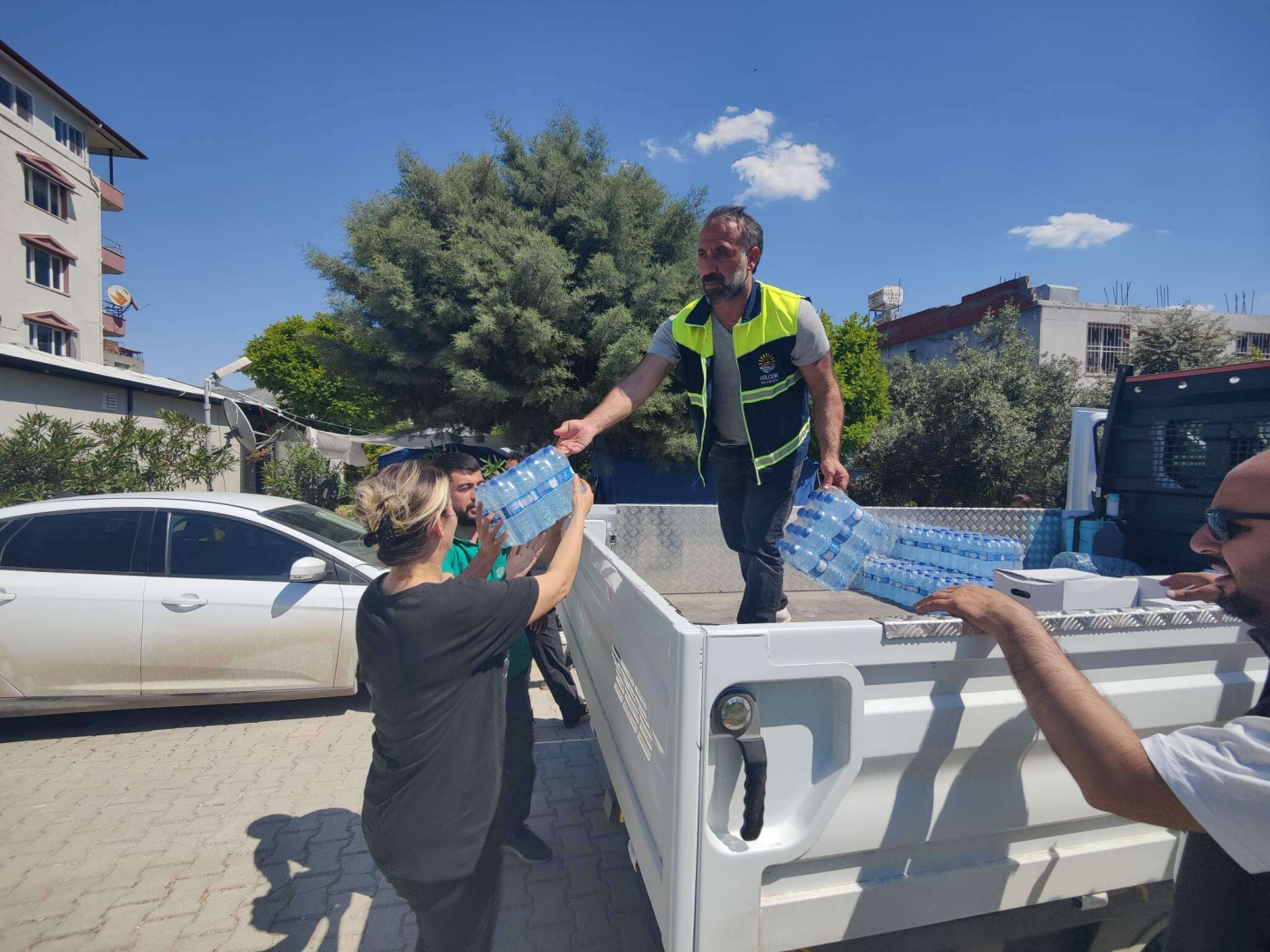 Gölcük Belediyesi ekipleri, deprem bölgesi Hatay’da mahalle mahalle gezerek erzak ve su dağıtımlarına aralıksız sürdürüyor.