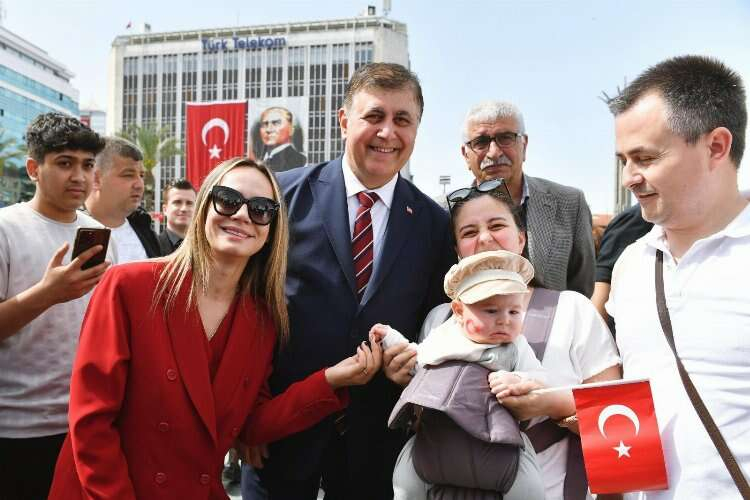 Renkli görüntülere sahne olan törende İzmirlilerle bayramlaşan Başkan Dr. Cemil Tugay, çocuklar ve aileleriyle hatıra fotoğrafı çektirdi.