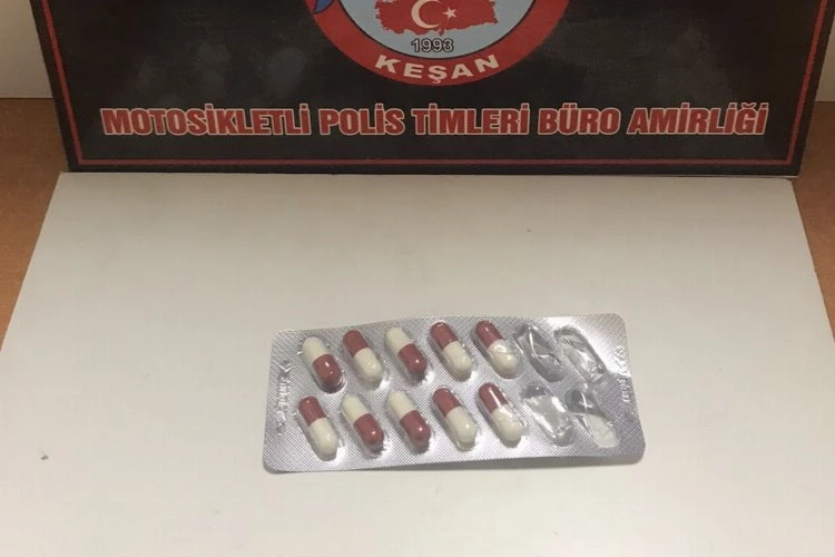 Erdoğan DEMİR / EDİRNE (İGFA)  - Edirne'de Keşan Emniyet Müdürlüğü'ne bağlı ekipler, Yeni Mescit Mahallesi'ndeki devriyeleri sırasında farklı zamanlarda durumundan şüphelenilen durdurdukları M.Y ve Ç.K adlı şahsıların kaba üst yoklamasında; 6 adet mor renkte extasy tabir edilen uyuşturucu hap ile tablet halinde 10 adet Galara marka sentetik uyuşturucu hap ele geçirdi.