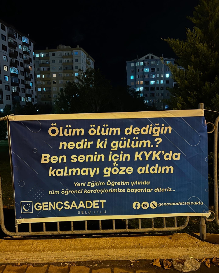 Saadet Partisi Selçuklu İlçe Gençlik Kolları, Selçuk Üniversitesi ve Konya Teknik Üniversitesi'nde okuyan öğrenciler için pankart hazırladı. Pankartlar sosyal medyada gündem oldu.