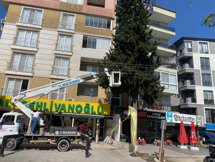 MUĞLA (İGFA) - Elektrik iletim hatlarının güvenliği hususunda risk oluşturan tellere temas eden ağaç dallarını budamak için elektrik kesintisinin olduğu bölgelerde hızla hareket eden Milas Belediyesi Park Bahçeler Müdürlüğü’ne bağlı ekipler, ağaç dallarını budayarak iletim hatlarının olası bir fırtınada zarar görmesini engelledi.