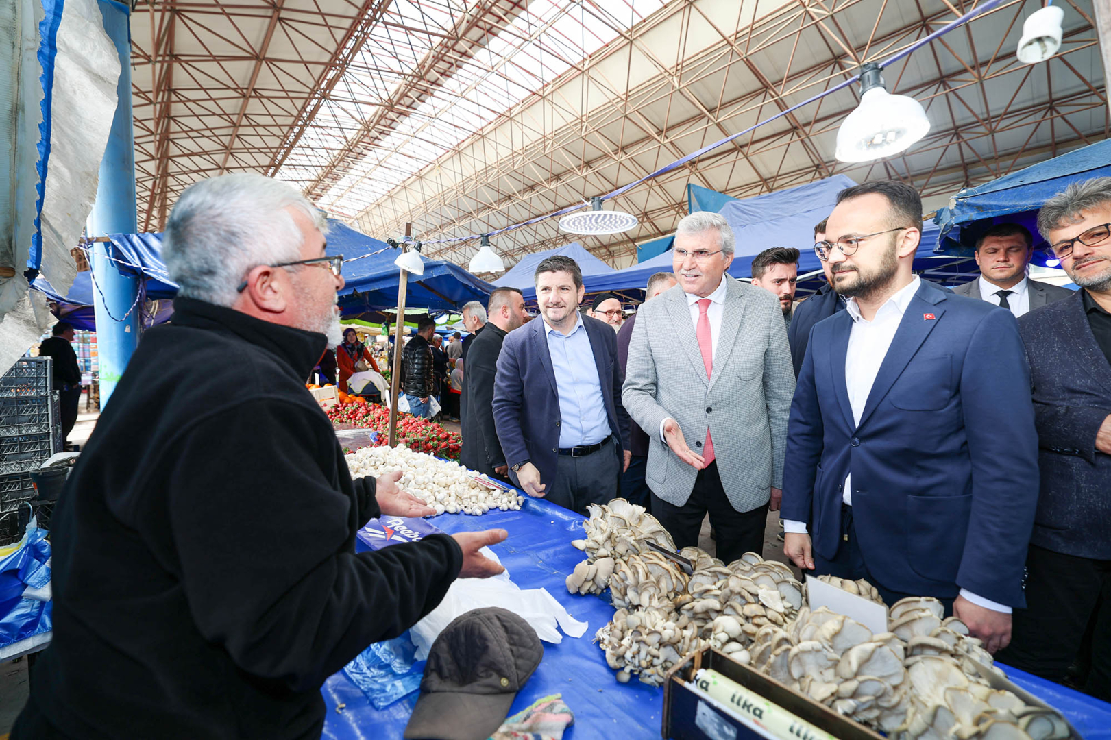 Sakarya Büyükşehir Belediye Başkanı Ekrem Yüce, seçim öncesi vatandaşla bire bir temas ettiği saha çalışmalarına Cuma Pazarı’nda devam etti