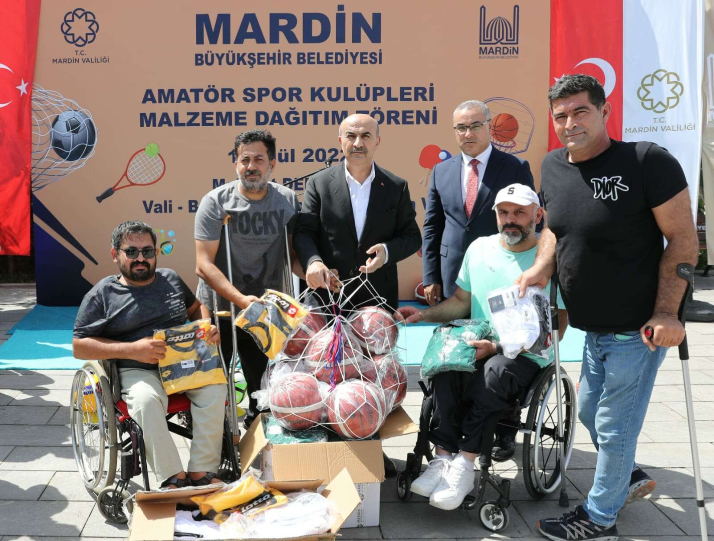 Mardin Büyükşehir Belediyesi'ne bağlı Sosyal Hizmetler Daire Başkanlığının 15 Temmuz Demokrasi ve Şehitler Parkında gerçekleştirdiği programda Mardin ve ilçelerinde bulunan 65 amatör kulübün tüm alt branşlarına 5 milyon TL değerinde spor malzemesi dağıtıldı.