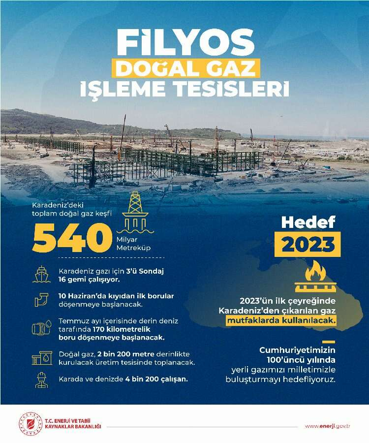 Enerji ve Tabii Kaynaklar Bakanlığı, "Karadeniz gazı için tarihler 2023’ü gösteriyor" notuyla Filyos Doğal Gaz İşleme Tesisleri ile ilgili bilgiler paylaştı.